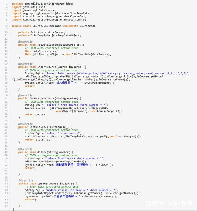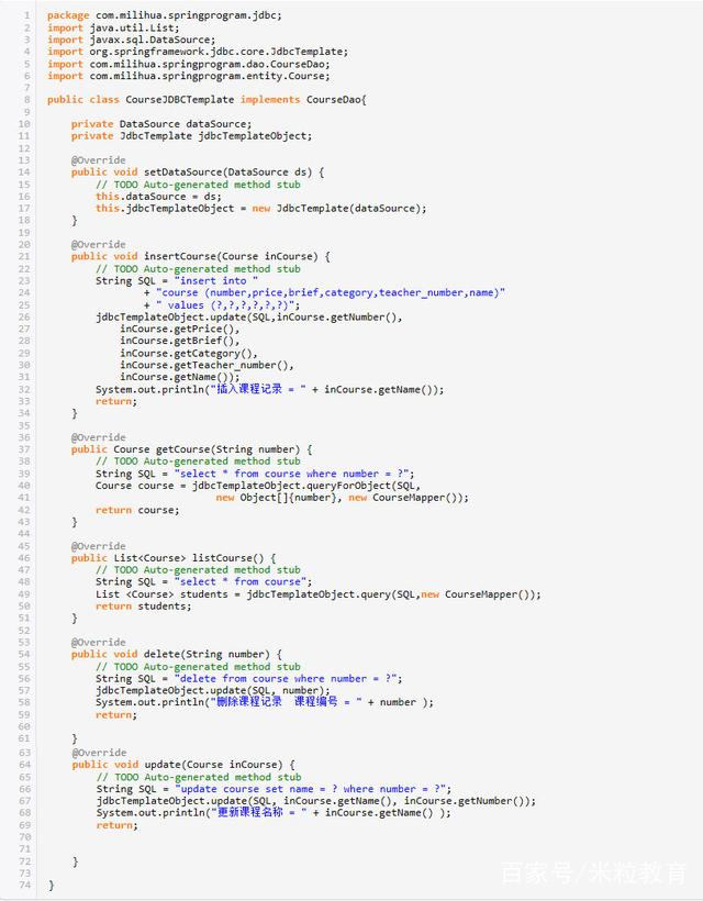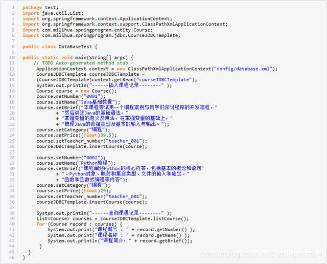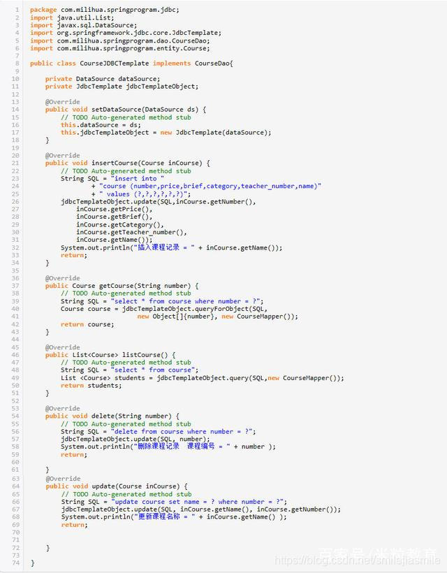 CourseJDBCTemplate类实现了CourseDao接口,并实现了接口的所有方法。CourseJDBCTemplate类内置了DataSource和JdbcTemplate类。DataSource为数据源类,存储了数据源的连接地址、登录数据源的账号密码等数据。JdbcTemplate类是Spring对JDBC的封装,JdbcTemplate 类可以执行 标准的SQL 语句和过程调用,创建JdbcTemplate类时传入的参数为DataSource。