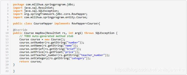 数据访问对象实现类实现DAO接口,并负责从mooc数据库中读取数据。在Spring中,可以采用JDBC、Hibernate、MyBits、JPA等技术在DAO层实现对数据库的访问。本科采用JDBC技术,JdbcTemplate类是Spring对JDBC的封装,让JDBC更加容易使用,JdbcTemplate 类可以执行 标准的SQL 语句和过程调用。数据访问对象实现类代码如下。