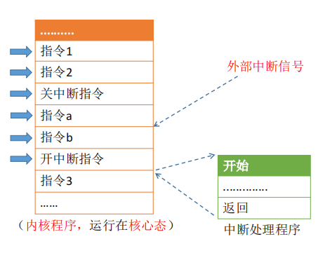 如何保证操作的原子性呢?这里我们需要引出两个特权指令:开中断指令和关中断指令。顾名思义,开中断就是将中断打开,关中断就是将中断关闭。我们将要执行的操作放在开中断与关中断指令的中间,CPU执行了关中断指令之后,就不再例行检查中断信号,直到执行开中断指令之后才会恢复检查。这样,关中断、开中断 之间的这些指令序列就是不可被中断的,这就实现了“原子性”。