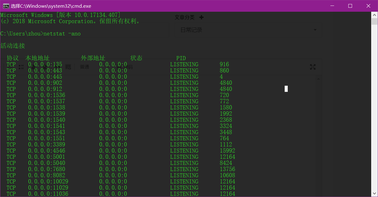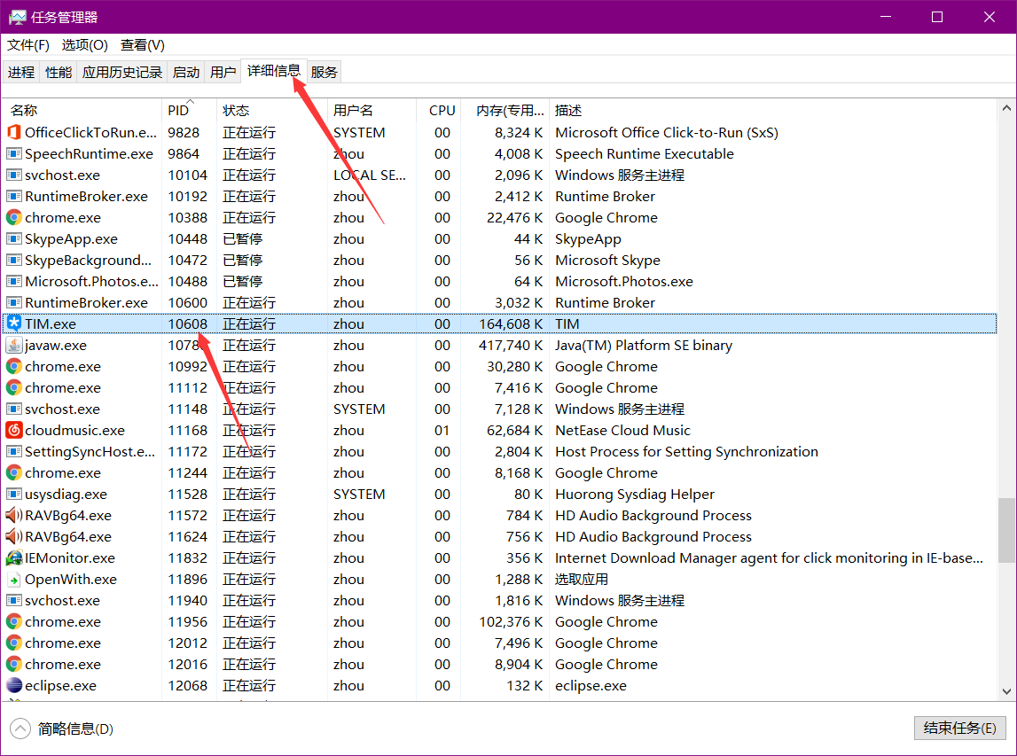按 win + R 打开cmd 输入 netstat -ano 例如,我们发现58332端口被占用了,然后最后显示的PID位10608 下面我们要找出占用这个端口的程序 输入tasklist|findstr "10608" 回车,发现是TIM占用的 或者我们打开任务管理器,来查看PID位10608的进程 来源:oschina链接:https://my.oschina.net/u/3980622/blog/2878324 标签 task_list