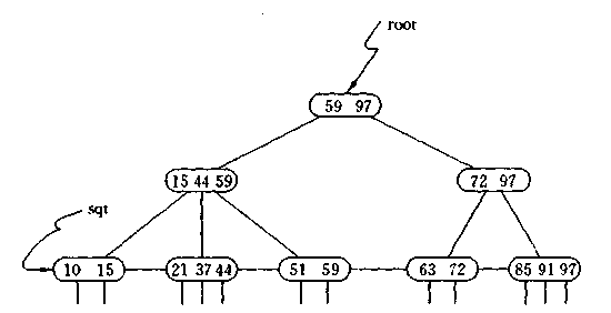 B+树通常有两个指针,一个指向根结点,另一个指向关键字最小的叶子结点。因些,对于B+树进行查找两种运算:一种是从最小关键字起顺序查找,另一种是从根结点开始,进行随机查找。