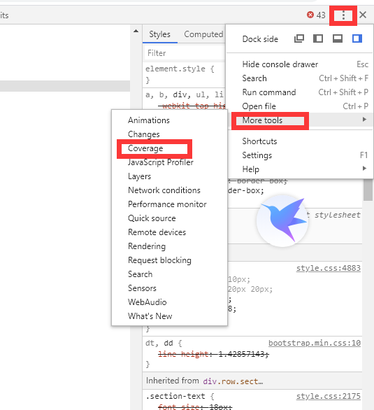 这个使用很简单,打开这个网页,然后打开开发者工具,在开发者工具中找到More tools-> coverage,如下图