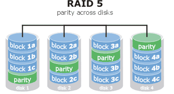 RADI5就是把硬盘设备的数据奇偶校验信息保存到除自身之外的其他每一块硬盘设备上,实际上并没有备份硬盘中的真实数据信息,当硬盘设备损坏时,是通过奇偶校验来尝试重建损坏的数据。