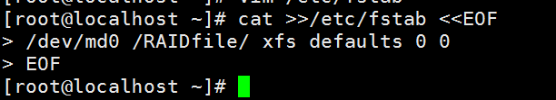 - 将/dev/md0 磁盘阵列详细信息写入/etc/fstab的配置文件