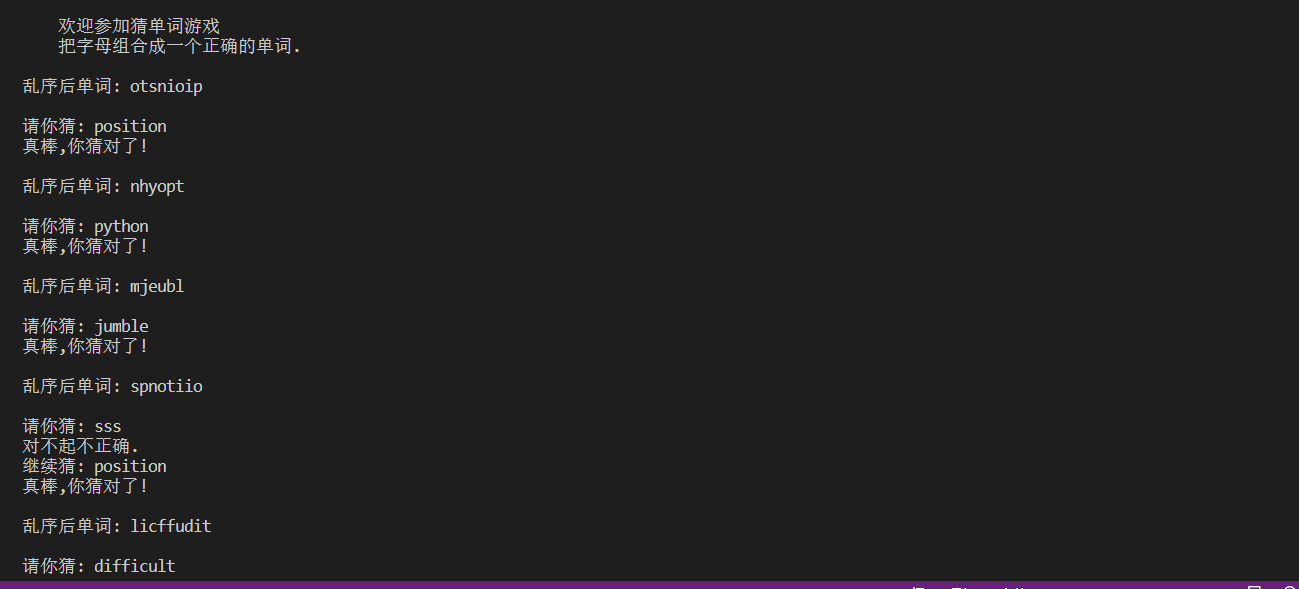 5.玩家输入猜测单词,程序判断对错。若玩家猜错,则可以继续猜。