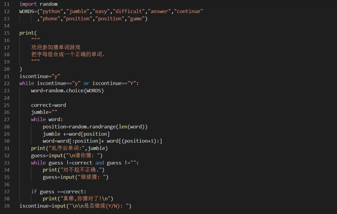 在游戏中,随机挑出一个单词word后,把单词word的字母顺序打乱的方法是随机单词字符串中选择一个位置position,把position位置的字母加入乱序后的单词jumble,同时将原单词word中position位置的那个字母删去(通过连接position位置前字符串和其后字符串实现)。通过多次循环就可以产生乱序后的新单词jumble。
