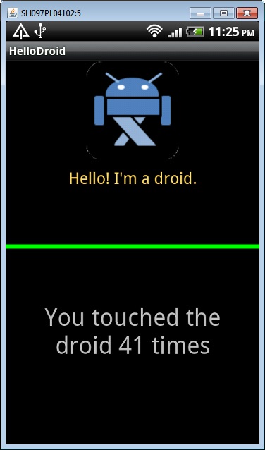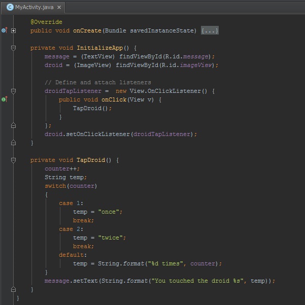 TapDroidmethod只是用来记录用户触摸图片的次数,并显示一个汇总信息。需要添加到MyActivity类用来记录点击次数: