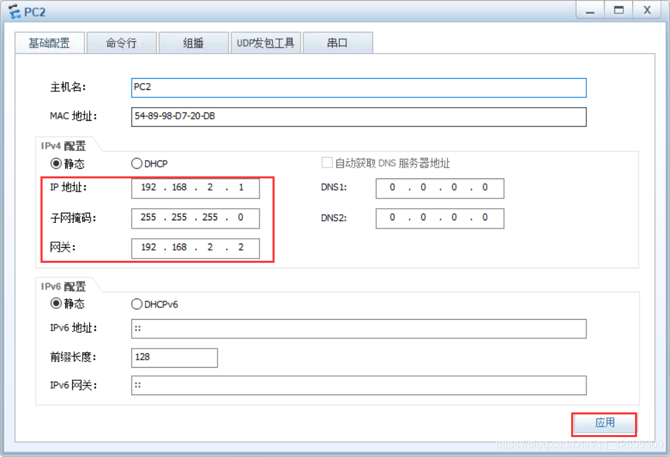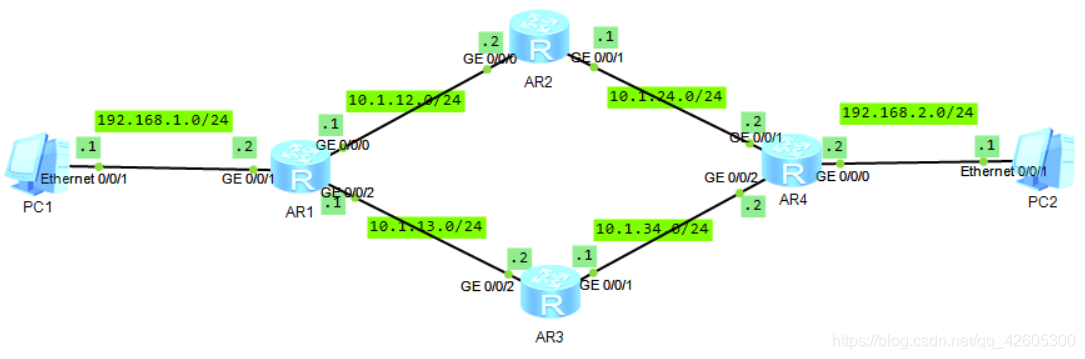 实验要求通过静态路由实现整个网络可以访问两台PC,同时要求从PC1--->PC2经过AR2转发、从PC2--->PC1经过AR3转发。