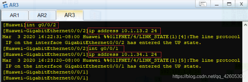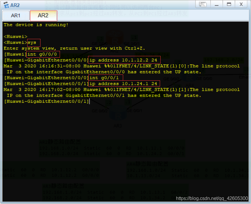 所以,咱们到AR1配置上面指出的两条路由,如下: