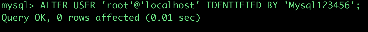 ALTER USER 'root'@'localhost' IDENTIFIED BY 'Mysql123456';