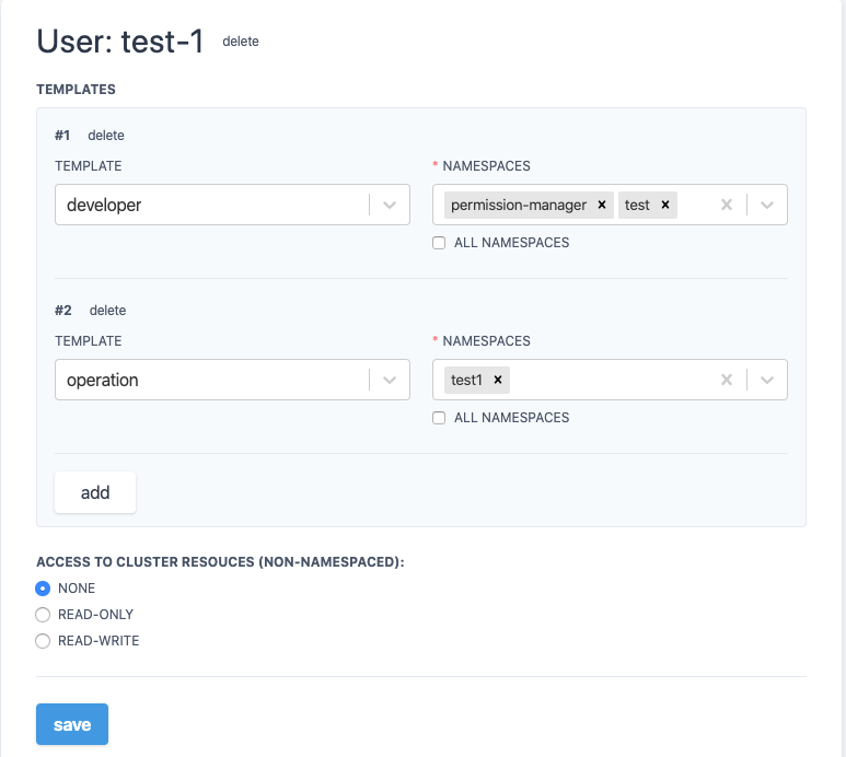 默认只有 developer 和 operation 模板,模板都是以 template-namespaced-resources___ 为开头。添加新的权限模板,可以参考 k8s/k8s-seeds/seed.yml 文件。
