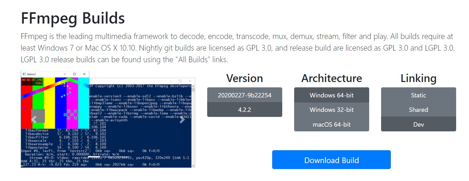 static: 该版本提供了静态版本的FFmpeg工具,将依赖的库生成在了最终的可执行文件中;作为工具而言此版本就可以满足我们的需求;