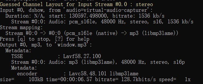 ffmpeg -f dshow -i audio="virtual-audio-capturer" -acodec libmp3lame window.mp3