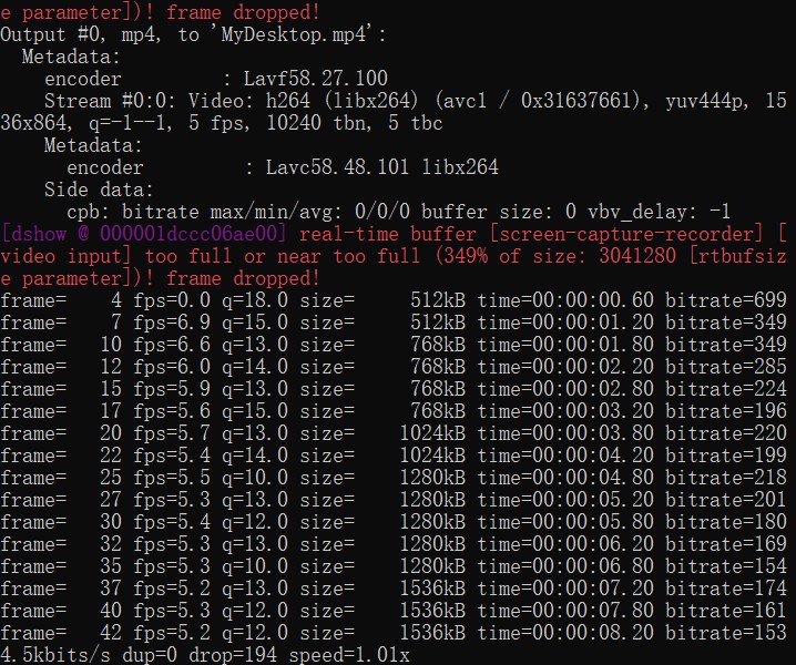 ffmpeg -f dshow -i video="screen-capture-recorder" -r 5 -vcodec libx264 -preset:v ultrafast -tune:v zerolatency MyDesktop.mp4