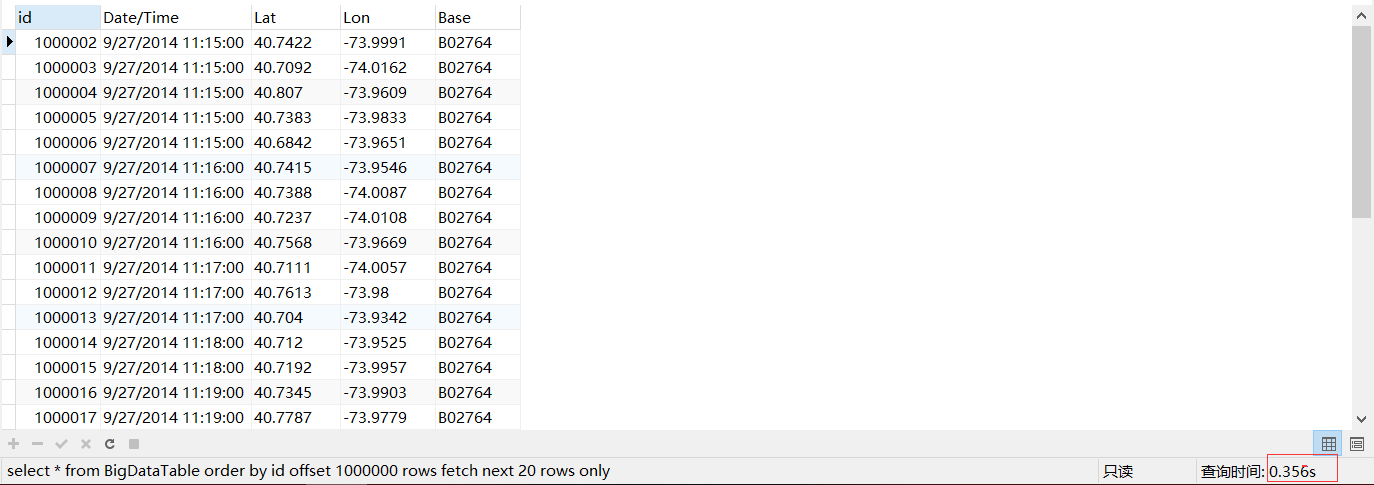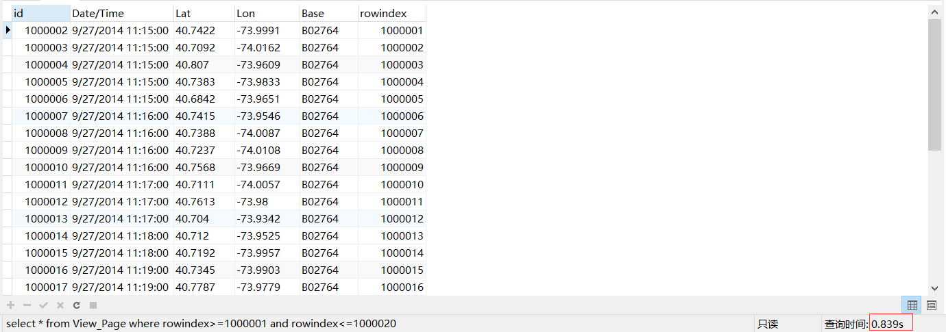 分别使用上述三种SQL来取得1000001-1000020条数据来进行对比。