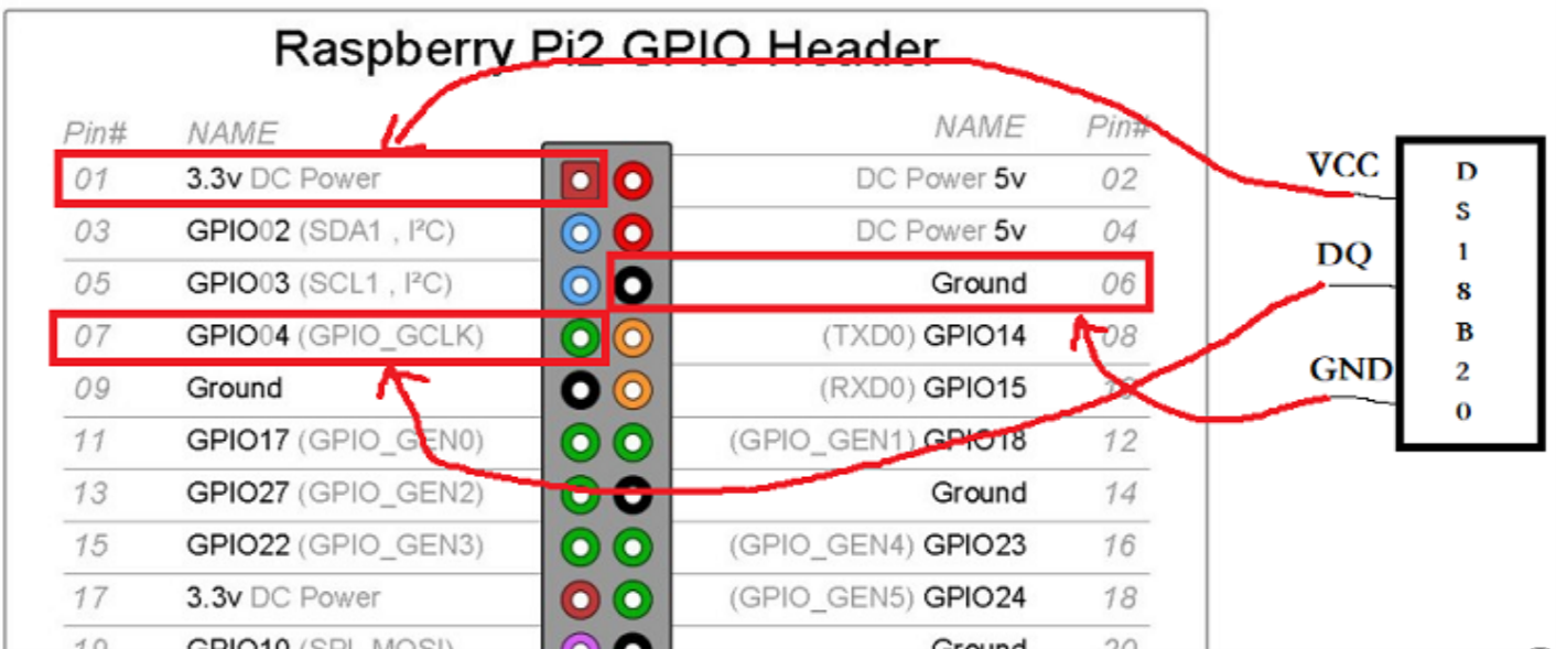 树莓派的 gpio 04 端(pin 07 脚)--------------连接DS18B20的 DQ的端口;