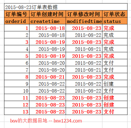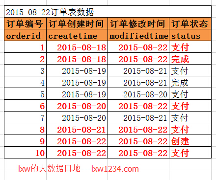 10. 2015-08-21至2015-08-23,每天原系统订单表的数据如下,红色标出的为当天发生变化的订单,即增量数据: