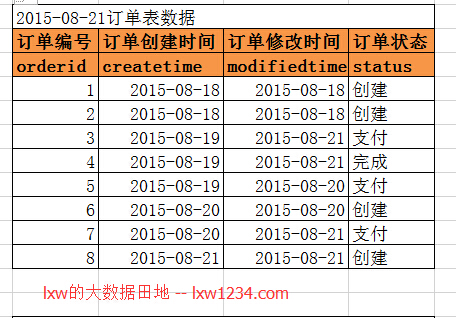 订单1在2015-08-21的时候还处于创建的状态,在2015-08-22的时候状态变为支付。