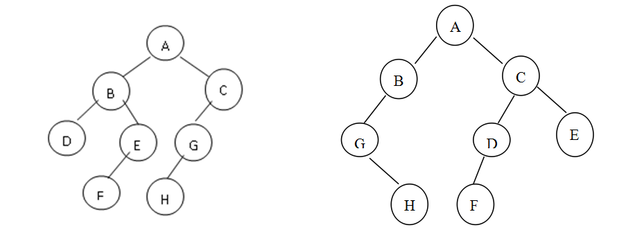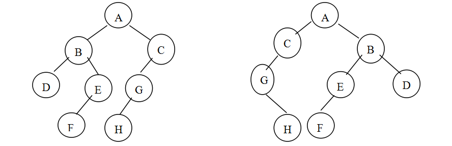 给定两棵树T1和T2。如果T1可以通过若干次左右孩子互换就变成T2,则我们称两棵树是“同构”的。例如图1给出的两棵树就是同构的,因为我们把其中一棵树的结点A、B、G的左右孩子互换后,就得到另外一棵树。而图2就不是同构的。
