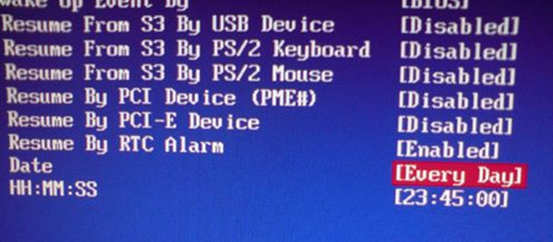 找到RTCAlarm([əˈlɑ:m] 报警),将Disabied 更改为Enabled,然后继续回车确定。然后再继续设置时间点和日期