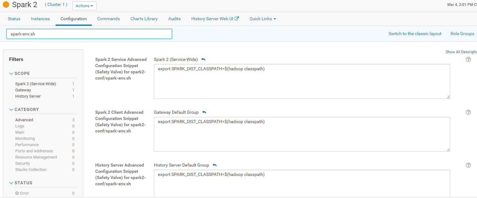 最近为了适配客户版本,搭建了CDH5.16版本的数据数据环境。而默认的Spark是1.6版本的,为配合客户需要升级成Spark2,由于机器资源有限制,先把Spark1.6删除了,下载SPARK2-2.1.0.cloudera3-1.cdh5.13.3.p0.569822-el7.parcel包,进行了安装。安装完成之后,运行Spark的相关命令就报java.lang.NoClassDefFoundError: org/apache/hadoop/fs/FSDataInputStream异常,我使用的命令是spark2-submit时报错,其实所有Spark相关命令都是一样的错误。