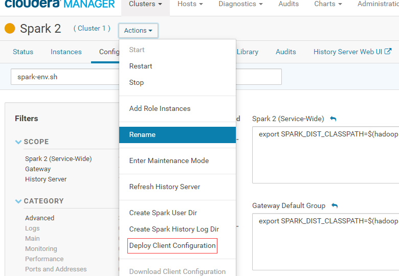 使用Spark的命令的机器需要安装Gateway组件,然后需要deploy client configuration(部署客户端配置)。个人认为既然使用CDH Manager,如果还去机器上直接改配置的,那还要CDH Manager干啥?网上有很多答案,都说教人要改这改那的,这命令那么命令的,可能别人也没搞明白为啥会出那样的问题。