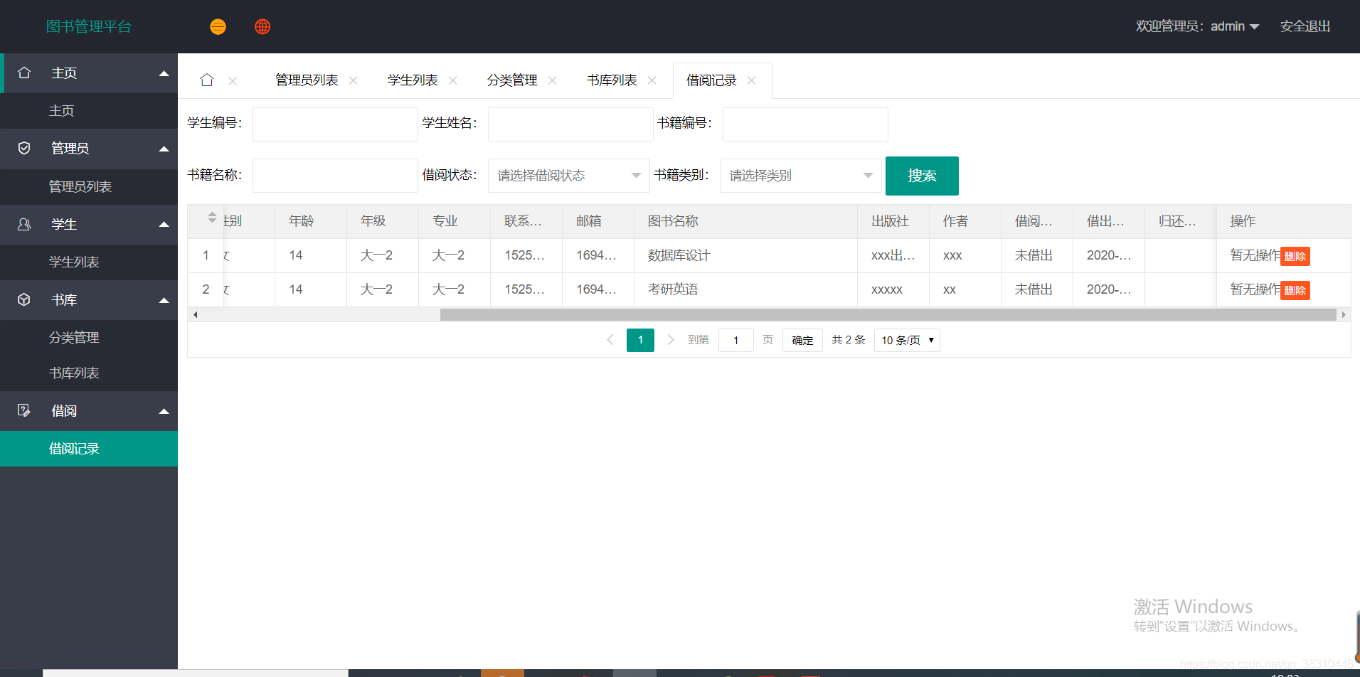 3.学生还书,后台管理员确认。