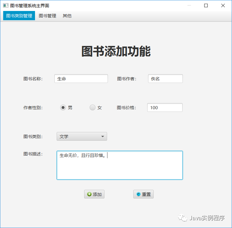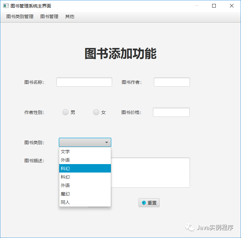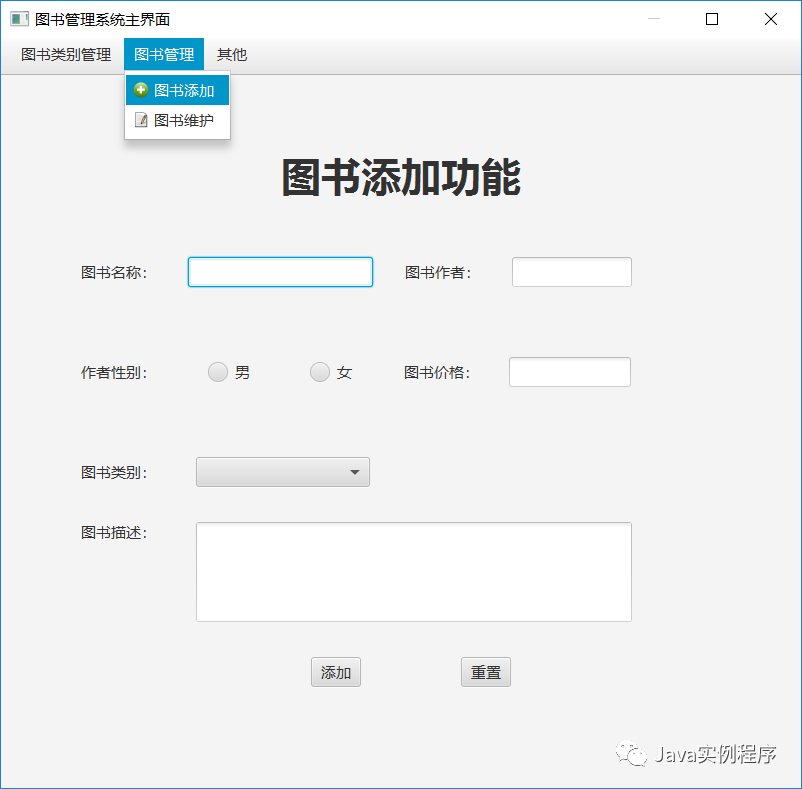 并在MainFrameController.java处理“图书添加”菜单项事件中进行调用: