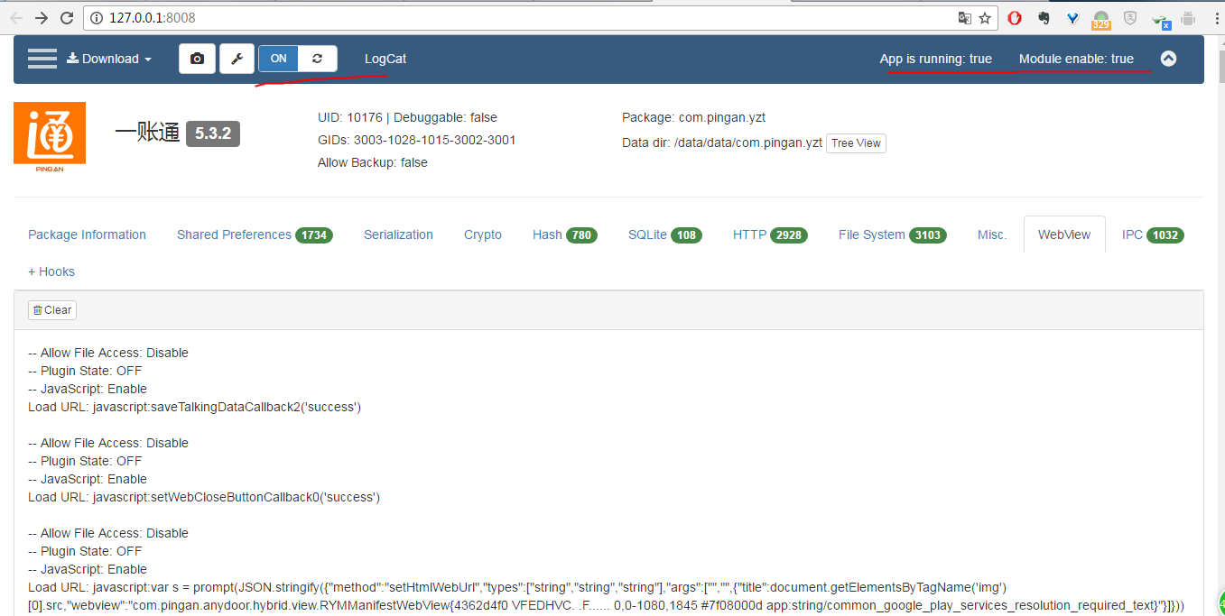 3)电脑上访问 http://127.0.0.1:8008 就可以看到Inspeckage的web界面。(如果web也买你没有输出结果,查看APP is running是否为true,Logcat左边分那个自动刷新按钮是否开启)