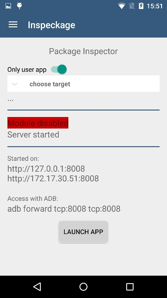 1)Inspeckage运行后,界面如下。Module disable表示没有安装xposed模块,在choose target下拉列表中选择要分析的app