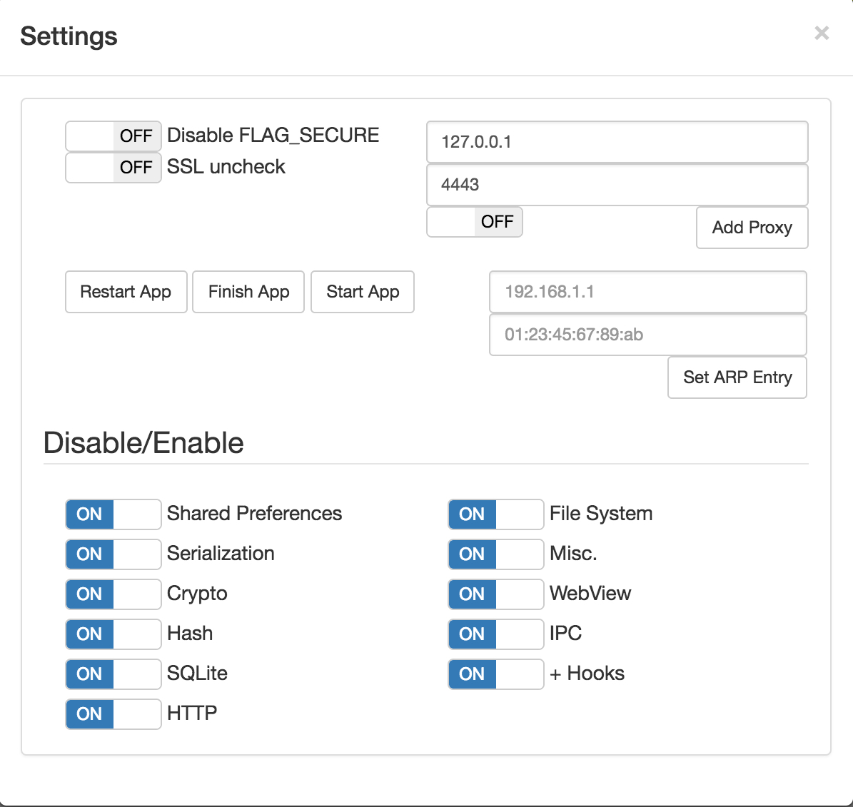 Inspeckage是一个用来动态分析安卓app的xposed模块。Inspeckage对动态分析很多常用的功能进行了汇总并且内建一个webserver。整个分析操作可以在友好的界面环境中进行。