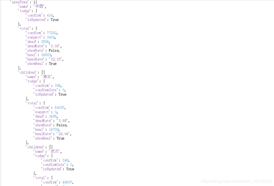 至此疫情数据就获取完毕,So yesy 的有木有,接下来需要统计疫情数据的 34 个省份信息,首先分析输出的数据,经过分析发现省份数据的 Json 头为 areaTree,详细信息如下图所示:
