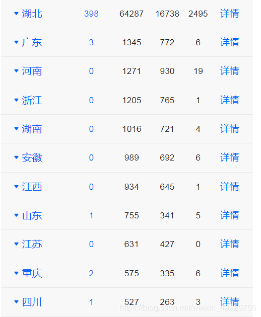 '湖北': 64287, '广东': 1345, '河南': 1271, '浙江': 1205, '湖南': 1016, '安徽': 989, '江西': 934, '山东': 755, '江苏': 631, '重庆': 575, '四川': 527,