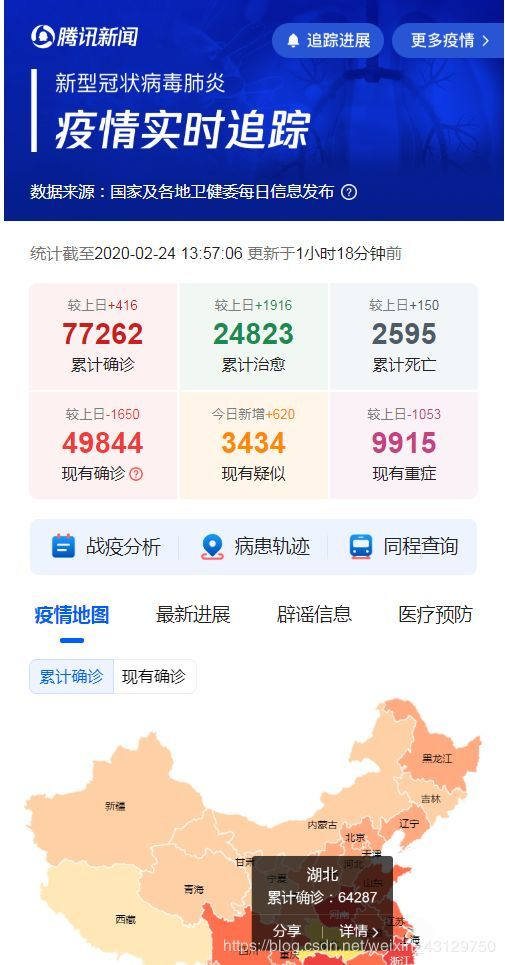 在百度中搜索 https://news.qq.com/zt2020/page/feiyan.htm 即可获得疫情实时追踪展示信息: