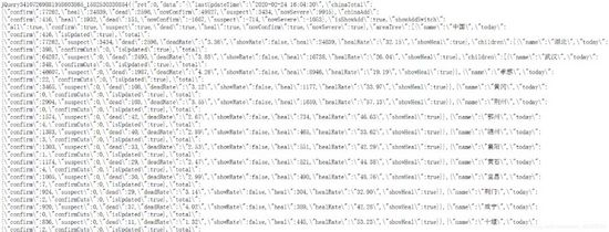 {'lastUpdateTime': '2020-02-24 17:06:26', 'chinaTotal': {'confirm': 77262, 'heal': 24839, 'dead': 2596, 'nowConfirm': 49827, 'suspect': 3434, 'nowSevere': 9915}, 'chinaAdd': {'confirm': 416, 'heal': 1932, 'dead': 151, ……