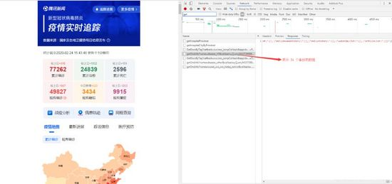 通过网页分析后了解到疫情数据是 JSON 类型,因此爬取的主要原理是通过 Requests 获取 Json 请求。然后再获取到各省份的相关数据,数据抓取代码如下: