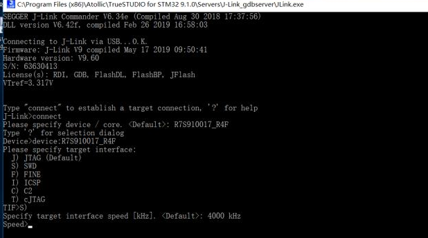 打开jlink.exe,输入connect命令,依次按照提示输入,device: 所选的芯片型号,接口S:SWD,其它默认即可,回车,看看是否连接成功。