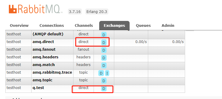 原因:查看下图红框中是否有exchange ‘amq.direct’,没有则会报错,添加即可