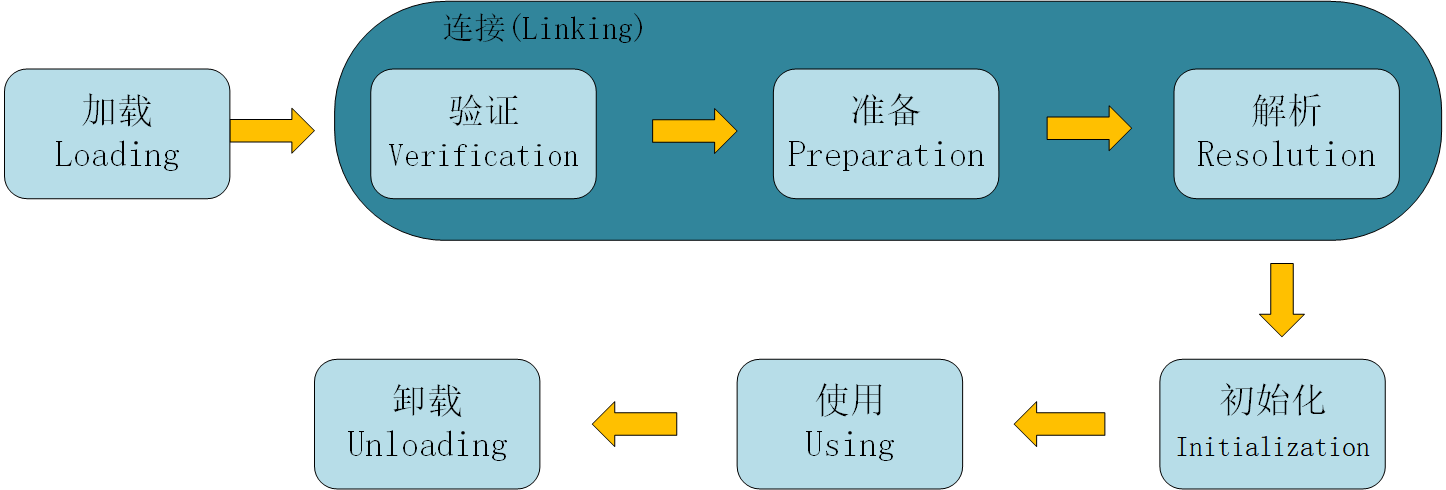 类从被加载到虚拟机内存中开始,到卸载出内存为止,它的整个生命周期包括:加载(Loading)、验证(Verification)、准备(Preparation)、解析(Resolution)、初始化(Initialization)、使用(Using)和卸载(Unloading)7个阶段。其中验证、准备、解析三个阶段统称为连接(Linking),这7个阶段的发生顺序如图:
