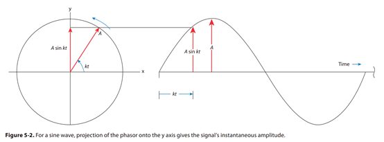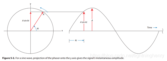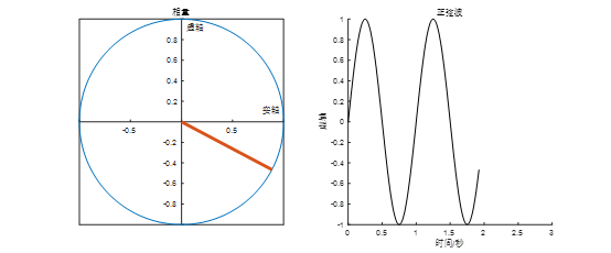 举例,使用相量来表示一个正弦波,如下图所示。左图中y轴为虚轴,x轴为实轴;右图中横轴为时间轴,纵轴为y轴。