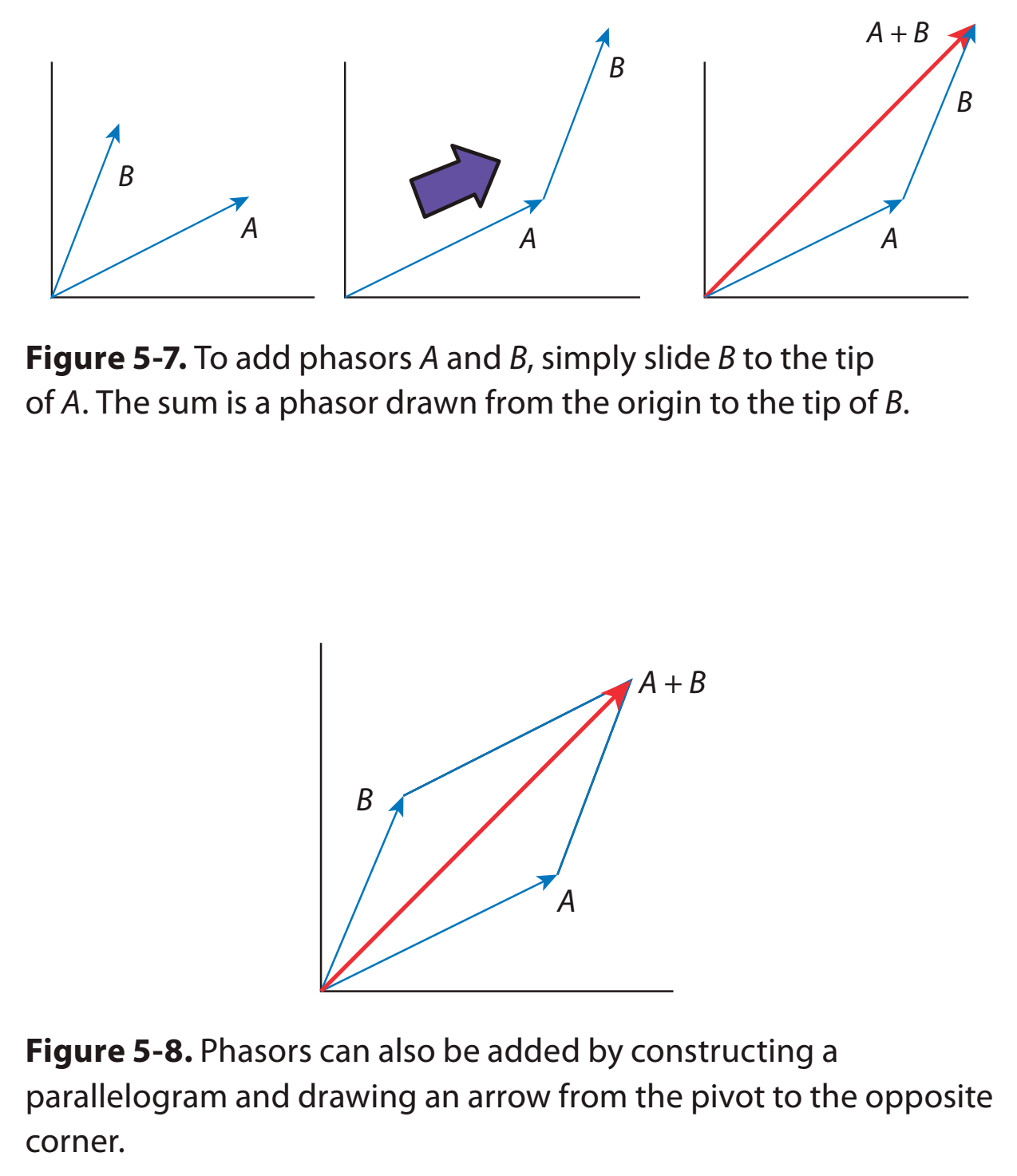 总结一下,这章主要是介绍了相量这一图形化的分析手段,非常直观方便。它与数学的方式相比各有优劣。比如,用相量来理解调幅就非常好,但是理解调频就比较困难。使用数学公式则相反,正好互补。