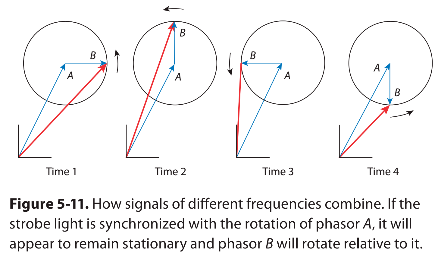 答:见下图。固定一个,另一个相对旋转,相对旋转速度为角频率之差。振幅为二者的相量和。红色线即为A、B信号的合成。