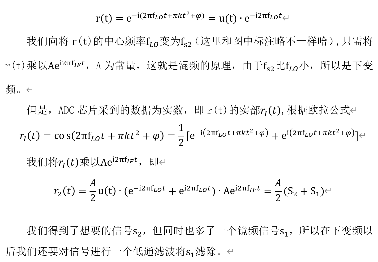 那镜像频率是如何产生的呢,在雷达信号处理的过程中,我们要对ADC采样后的数据进行下变频处理。我们假设回波数据r(t)的简略数学模型为: