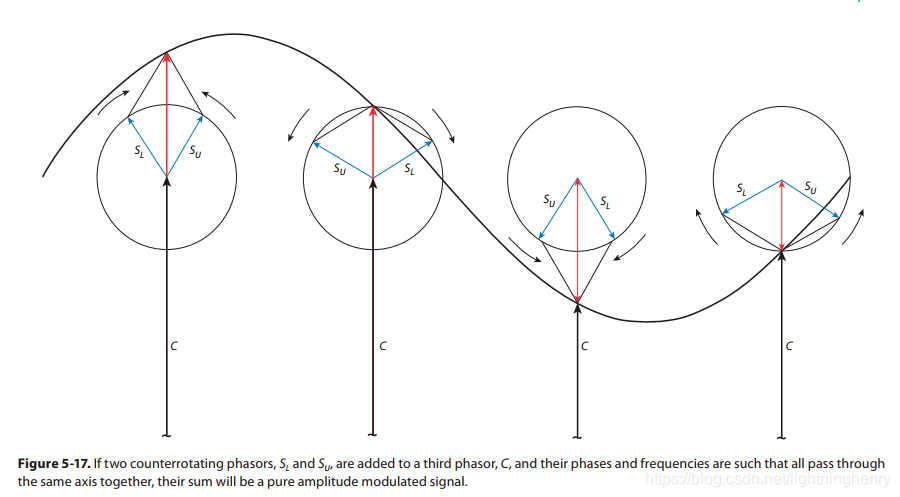 2)边带。这次我们用相量的方式来理解。如果我们将图5-16中的3个信号全部相加,会得到什么呢?看图5-17和图5-18。