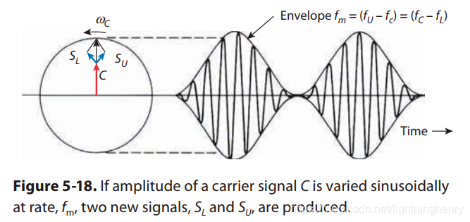 我们得到了一个调幅信号!是信号SL和SU(对应图5-16频谱中的fs1和fs2)对信号C(对应图5-16频谱中的fLO)。由于fs1和fs2分布在fLO的两边,所以fs1和fs2叫边带。
