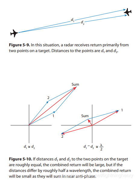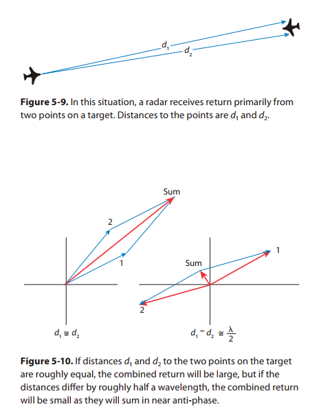 答:两个以上的回波合成会导致闪烁。如下图所示,飞机反射了两个回波。相量图旋转起来你就明白了,合成的回波的幅度呈周期性的变化,导致目标强度也呈周期性的变化,这种现象就叫闪烁。其实闪烁的频率是很快的,肉眼是看不到的。