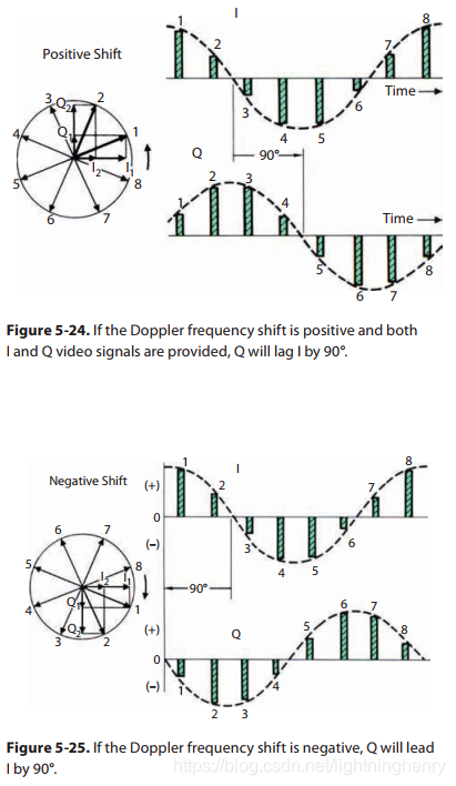 答:根据IQ分量计算出相位,通过相位变化的正负来确定多普勒信号的方向。如下图所示。相量12345678表示依次收到的8个回波,如果目标是相对静止的,则这8个回波的相位全部一样,在相量图上就不是下图中那样了,就是重合在一起了。如果目标是相对运动的,则这8和回波的相位就不一样了,大家可以仔细思考以下为什么不一样,相位的变化引起了频率的变化,这个频率的变化量就是多普勒频率。如果目标在靠近,则多普勒频率为正,相量图逆时针旋转;反之,顺时针旋转。