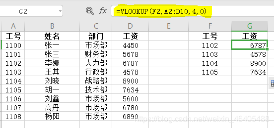 (1) 单条件查询(使用单个关键字检索,且检索关键字在选择区域的第一列。如下图检索关键字为工号,检索工号对应的工资)