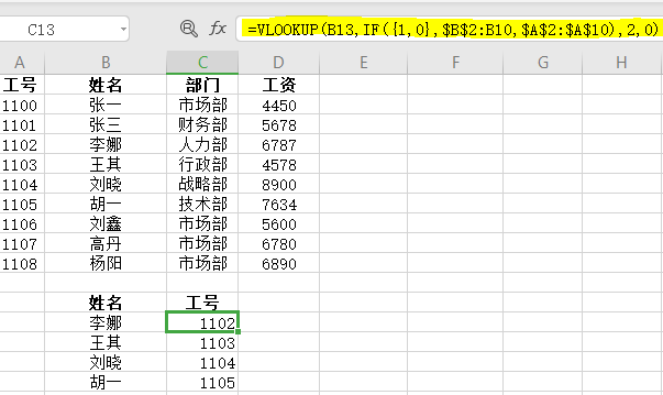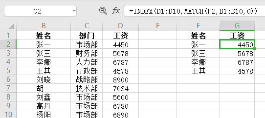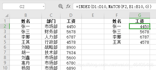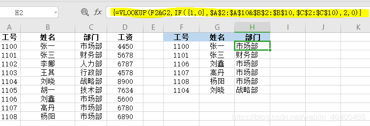 - 如下图:=VLOOKUP(F2&G2,IF({1,0},$A$2:$A$10&$B$2:$B$10,$C$2:$C$10),2,0) 下图为根据工号+姓名查找对应的部门