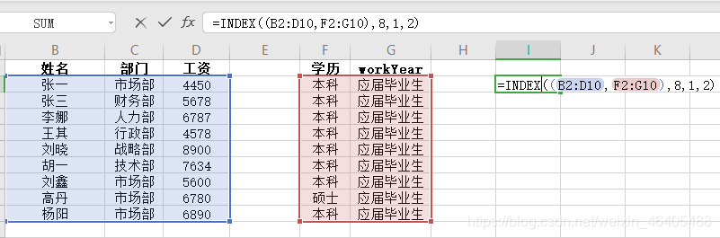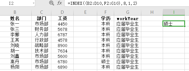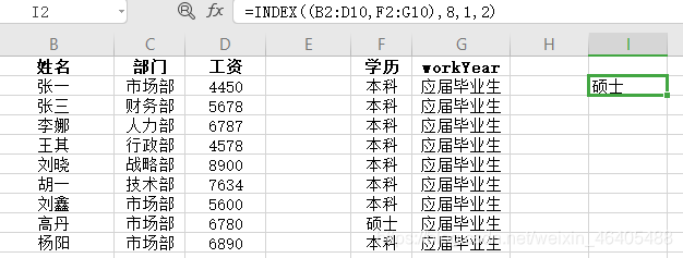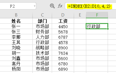 - 应用如下图:数组B2:D10, 行序数为4 ,列序数2。结果返回数组区域第四行第二列:行政部